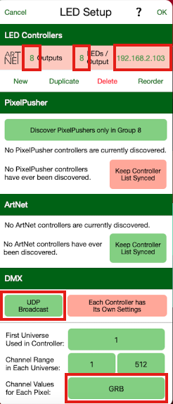 Important: DMX/ArtNet payload must be sent in GRB format, i.e. 3 bytes in Green/Red/Blue order.